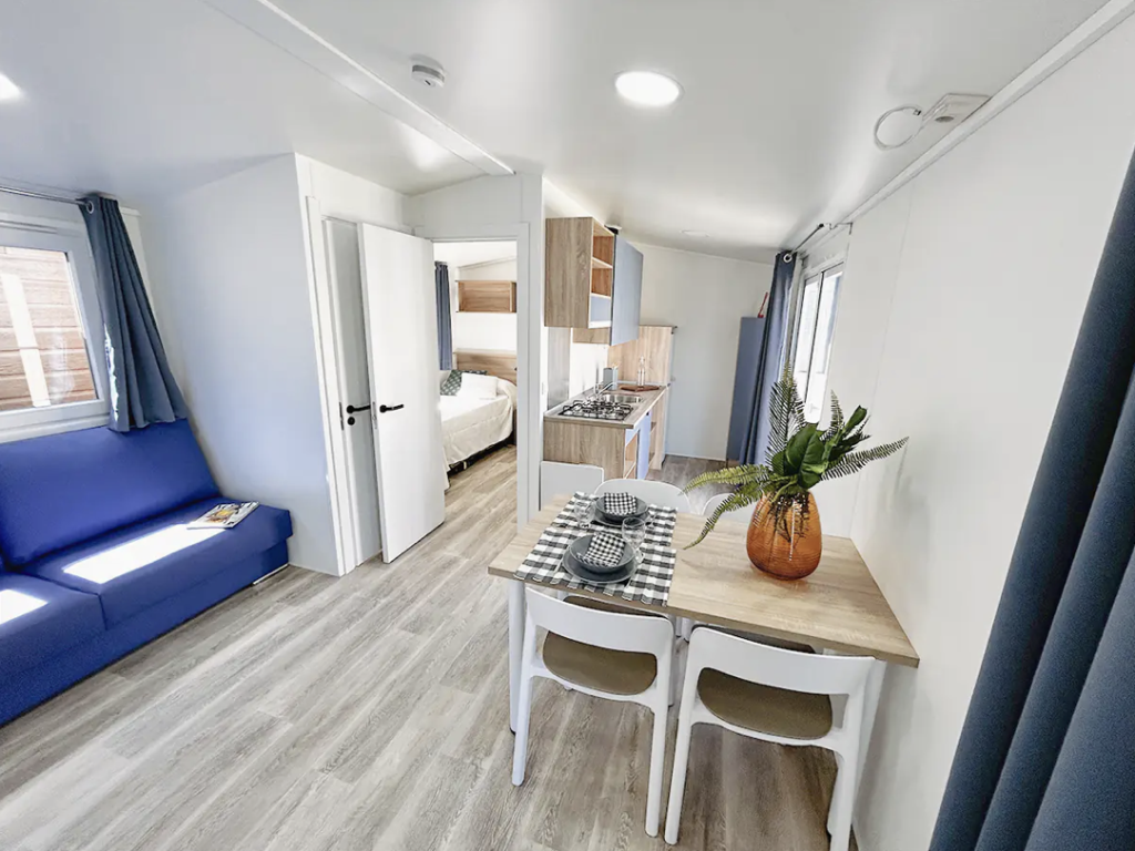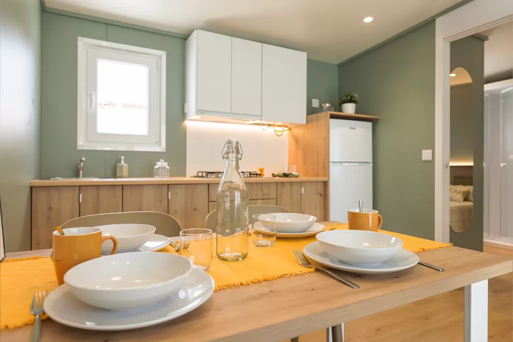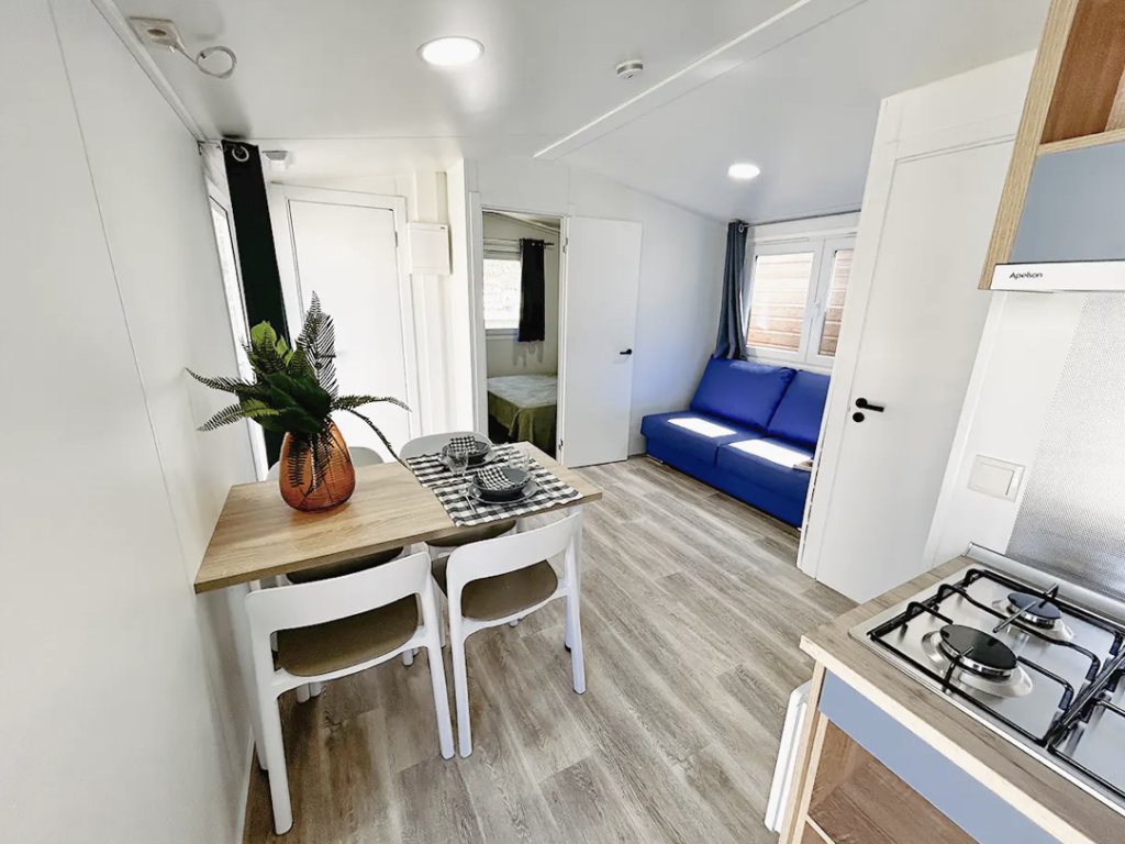 Ce mobil-home dispose d’un coin salon – salle à manger convivial, parfait pour partager de bons moments après une journée de découvertes. La cuisine équipée met à votre disposition tout le nécessaire pour votre séjour : vaisselle, cafetière, micro-ondes… afin de vous sentir comme à la maison.