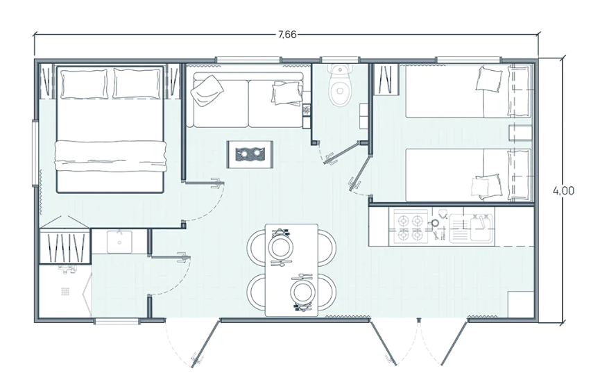 Ce module peut être associé à un second hébergement identique. Ensemble, ils permettent d’accueillir jusqu’à 4 personnes, tout en conservant l’indépendance de chacun. Idéal pour deux couples d’amis ou une famille souhaitant partager des moments conviviaux tout en préservant leur intimité.