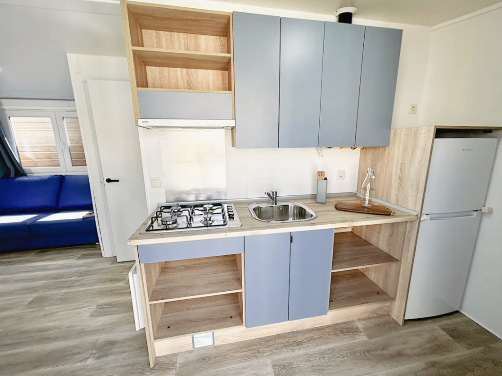 Entièrement climatisé et équipé d’une télévision, ce mobil-home dispose d’un coin salon – salle à manger convivial, parfait pour partager de bons moments après une journée de découvertes. La cuisine équipée met à votre disposition tout le nécessaire pour votre séjour : vaisselle, cafetière, micro-ondes… afin de vous sentir comme à la maison.