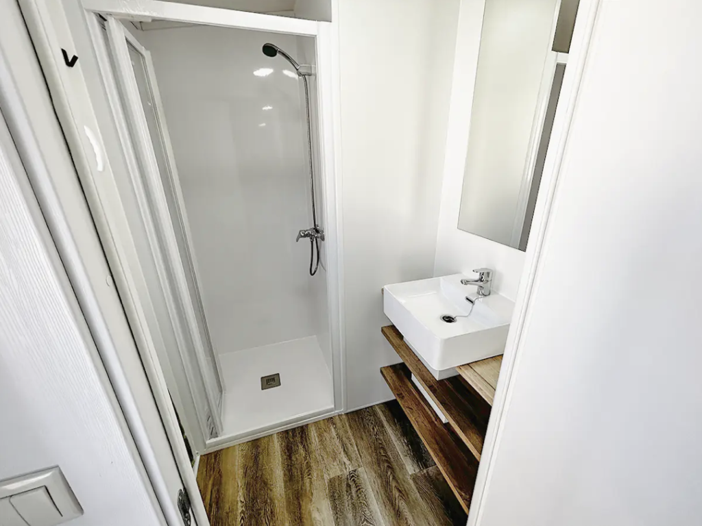 Le mobil-home comprend également une salle d’eau avec douche et lavabo, ainsi que des WC séparés, pour plus de praticité au quotidien.