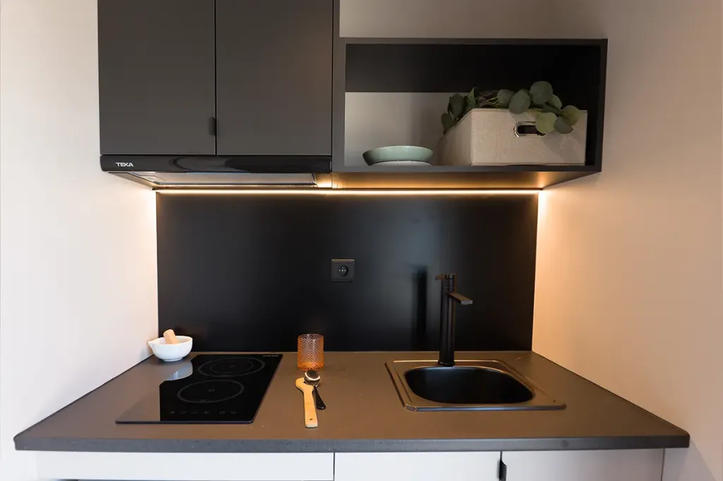 Le logement comprend un séjour convivial avec canapé, télévision et coin repas, ainsi qu’une cuisine ouverte entièrement équipée. Vous y trouverez un réfrigérateur, un micro-ondes, un grille-pain, une bouilloire et toute la vaisselle nécessaire pour préparer vos repas en toute simplicité.