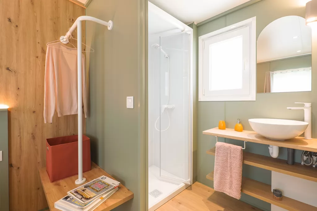 Le mobil-home comprend également une salle d’eau avec douche et lavabo, ainsi que des WC séparés, pour plus de praticité au quotidien.